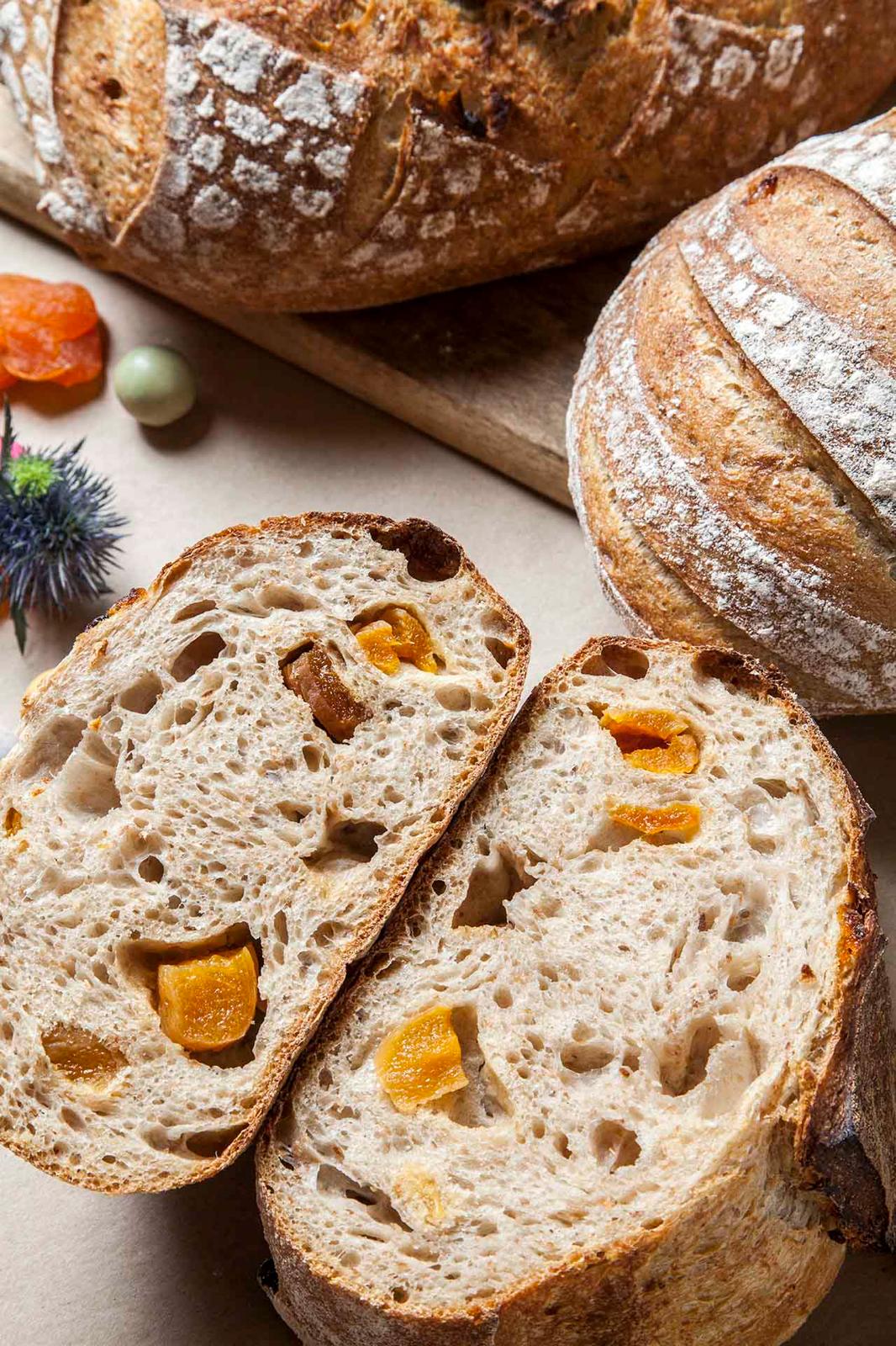 Chleb z pszennej mąki grafam, z suszonymi morelami.