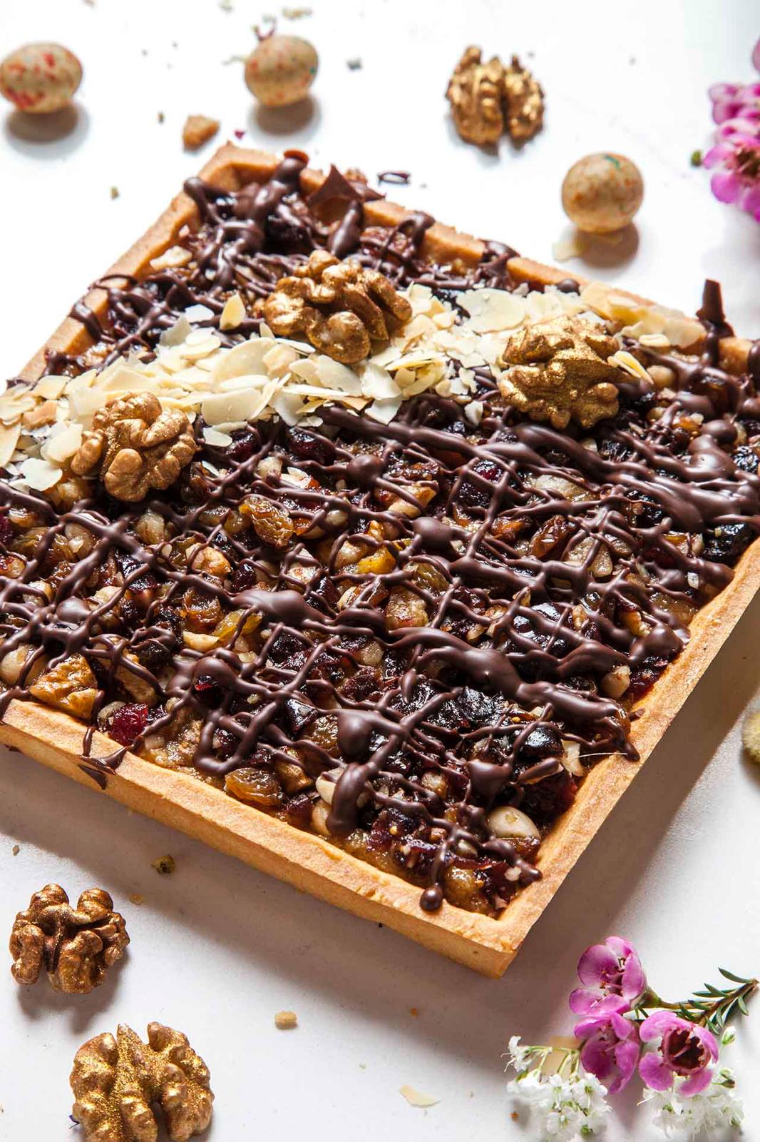 Kruchy maślany spód, masa migdałowo-kajmakow, dużo bakalii (migdały, orzechy, suszone morele, figi)