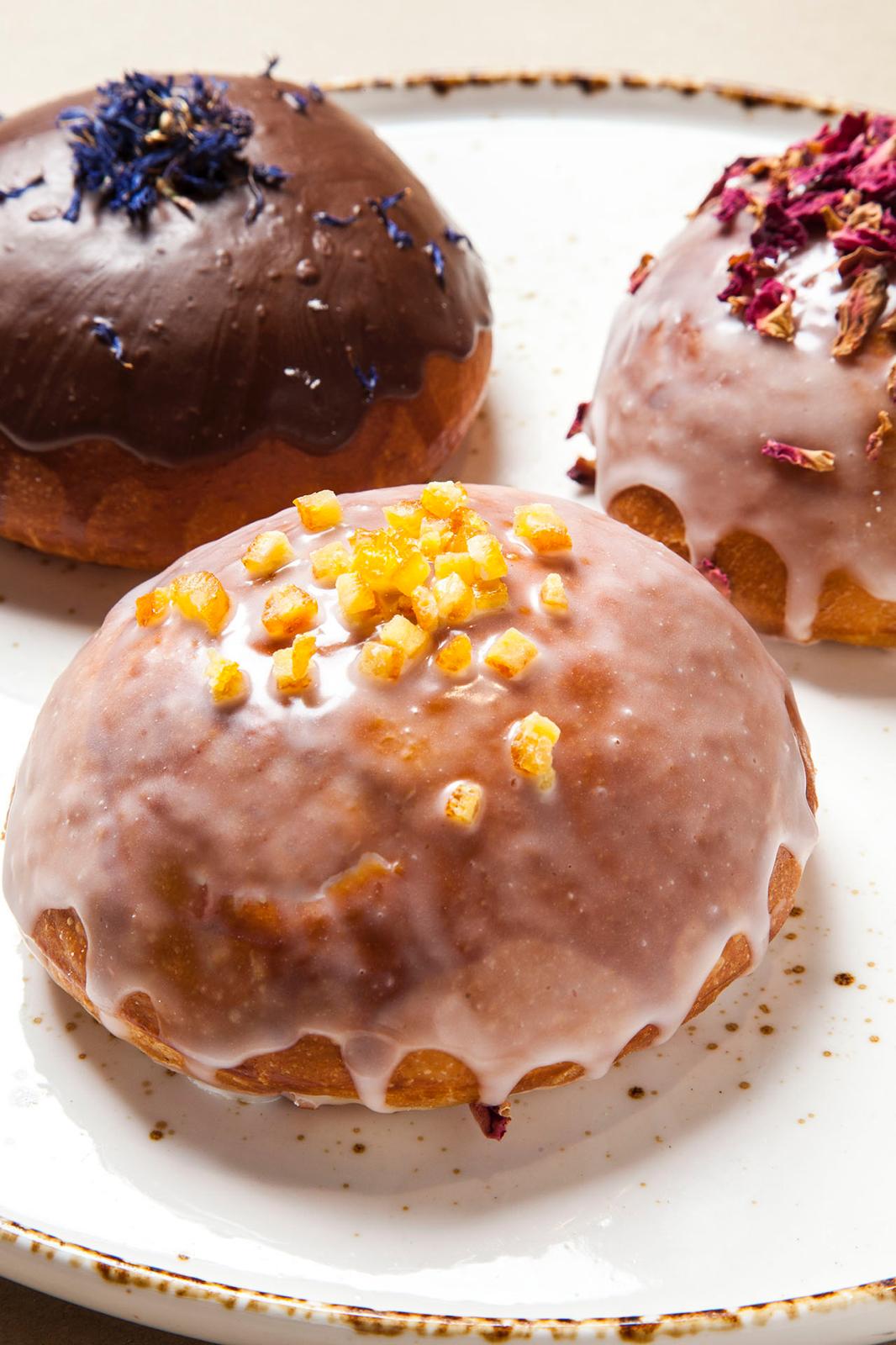 / Pączek smażony z konfiturą z płatków róży z lukrem i skórką pomarańczową
