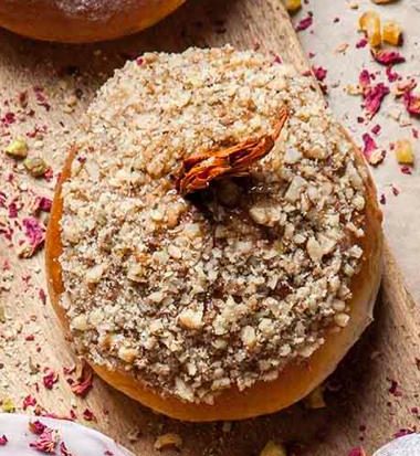 Pączek pieczony z konfiturą z płatków róży z lukrem i płatkami róży