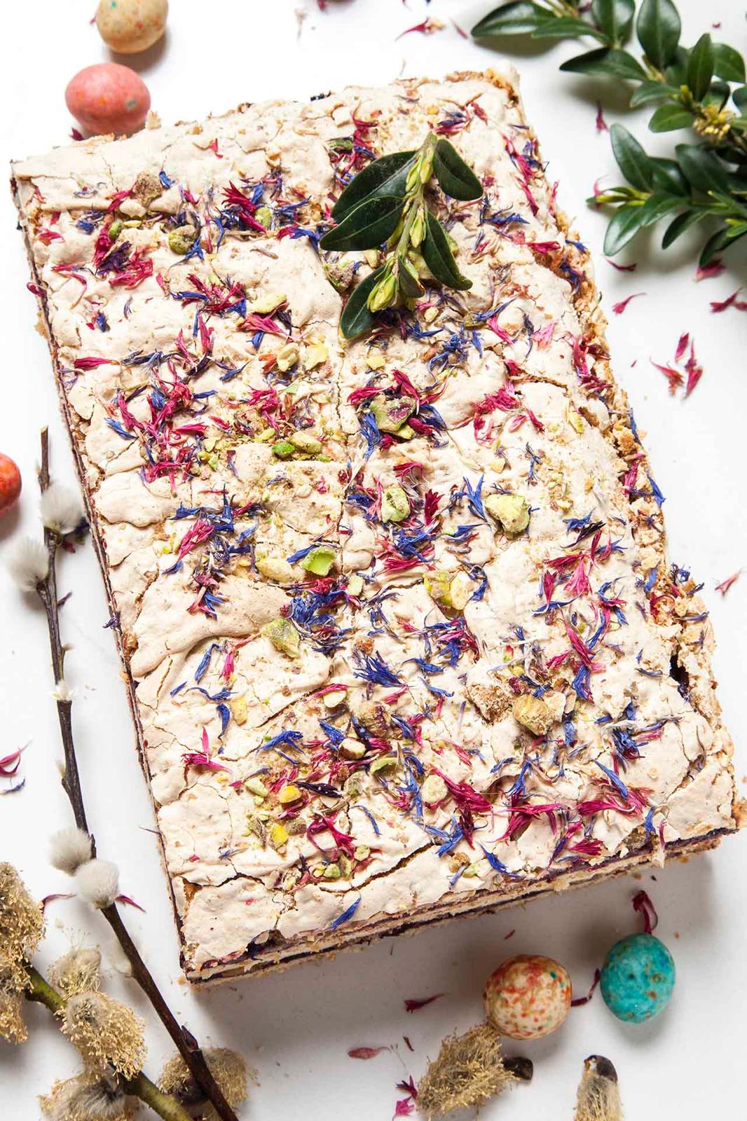 Kruche maślane blaty pieczone z konfiturą porzeczkową i bezą, przełożone kremem patisserie.